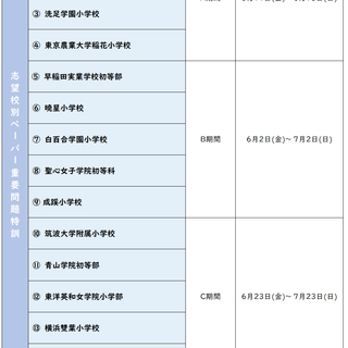 【年長】映像限定・パワーアップ講習会 『パワーアップ講習会』では、本番直前期を迎える大切なこの時期を「差をつける時間」「インプットを強化する時間」とし、映像授業を会員限定で実施します。夏前にリードしておきたい方にお勧めのカリキュラムです。 ■対象 年長(会員限定) ■お申し込み期間 受付開始:4月19日(水)11時 ~ ■お申し込み方法 マイページ よりお申し込みください(マイページにログイン>MENU>プログラム申込) ■プログラム 日程一覧 ※プログラムの詳細内容はマイページ(お知らせ欄)よりご覧いただけます 前へ 次へ 一覧へ戻る 一覧へ戻る
