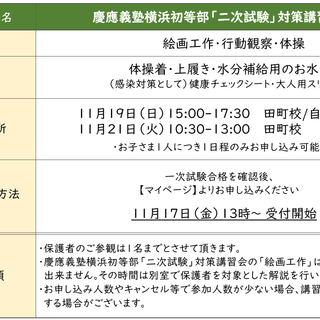 【年長】二次試験対策(面接演習/特別講習会) スイング幼児教室では、一次試験通過者を対象に「二次試験対策プログラム」を行います。これまで学習してきたことを確認し、自信をもって二次試験を迎えられるよう指導していきます。最後までスキルアップを目指していきましょう。 ■対象 年長会員(2017年4月2日~2018年4月1日生まれ)限定 ■プログラム詳細 ・早稲田実業学校初等部「二次試験」対策面接演習 ・慶應義塾横浜初等部「二次試験」対策講習会 ・筑波大学附属小学校「第二次選考」対策講習会 一覧へ戻る